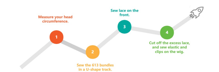 After sewing the lace, you can put the wig on your head, cut off the excess lace, and sew elastic and clips on the wig to prevent the wig from falling off while wearing it.